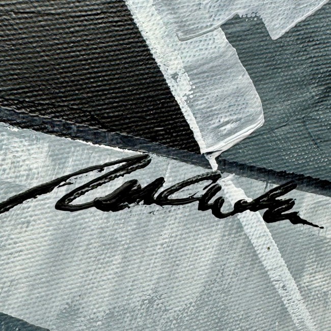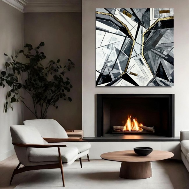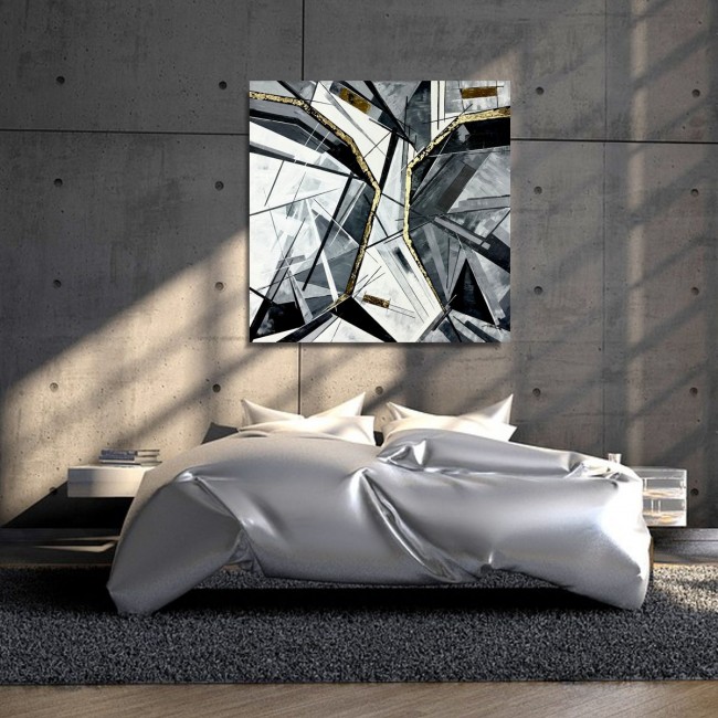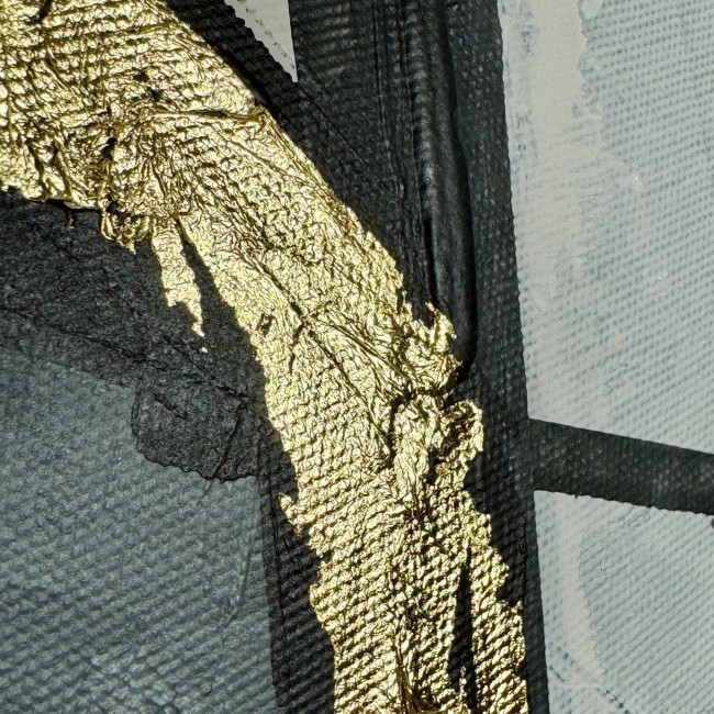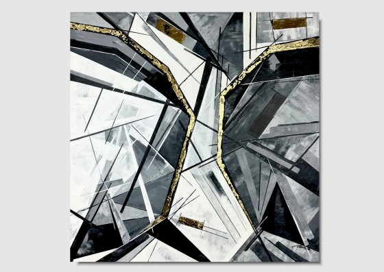 Kolorystyka obrazu obejmuje szary, biały, czarny, oraz złote płytki.